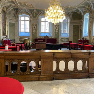 Pendant la visite, nous avons découvert plusieurs salles du bâtiment. Le décor était vraiment impressionnant. Il y avait de grandes arches en briques sombres, des plafonds décorés avec des motifs floraux et des vitraux colorés qui laissaient passer la lumière. Les formes des arches et les détails sur les murs rendaient les pièces très belles à regarder. On pouvait aussi voir un grand vitrail rond au plafond avec des couleurs et des motifs très travaillés. Nous avons aussi pu observer de nombreux tableaux des différents maires de la ville.